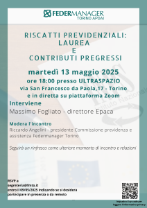 Federmanager Torino ha organizzato un evento per informare i propri associati sulle novità in tema di riscatti previdenziali. In collaborazione con il patronato Epaca Torino. Per informazioni e appuntamenti con i nostri esperti previdenziali è possibile chiamare lo 011.5625588 oppure inviare una mail a previdenza@fmto.it