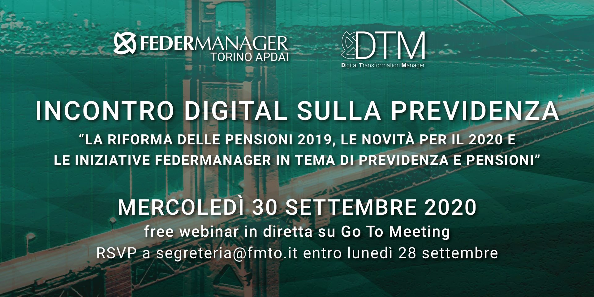Mercoledì 30 settembre dalle ore 17:00 si terrà il free webinar in diretta sulla piattaforma GotoMeeting dal titolo Incontro digital sulla previdenza.